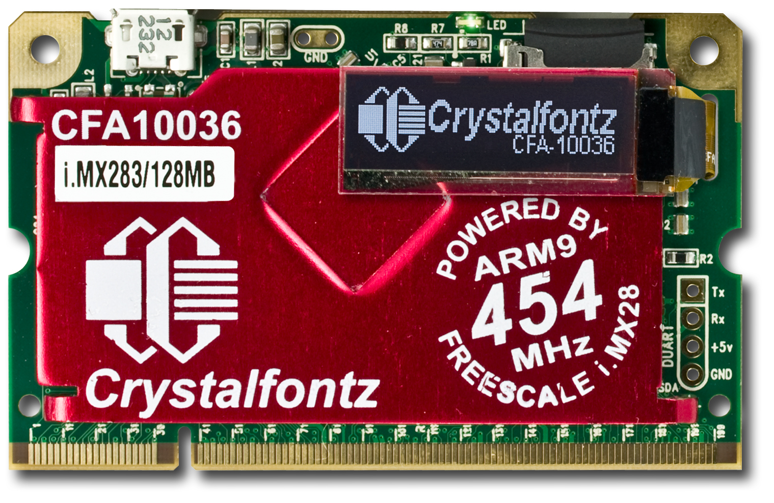 This kit includes the CFA10036 with the 454MHz Freescale i.MX283 processor with 128 MB RAM and a 128x32 OLED (CFAL12832D-B) you can use for status or debugging messages.