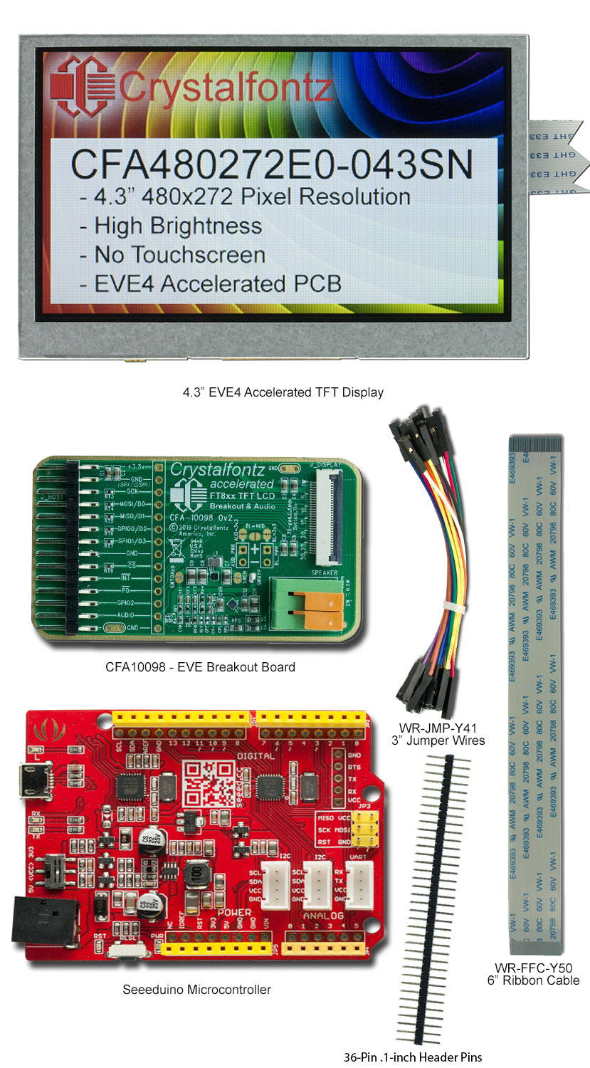 This development kit makes getting started with the 4.3" EVE module as easy as can be. The kit includes the fantastic 4.3" TFT EVE display module, an EVE breakout board, and a Seeeduino microprocessor wired together and running a demonstration for the display. This display is sunlight readable and requires more current for the backlight than the Seeeduino can supply, so the demonstration requires that you supply power to the breakout board to power the display backlight.