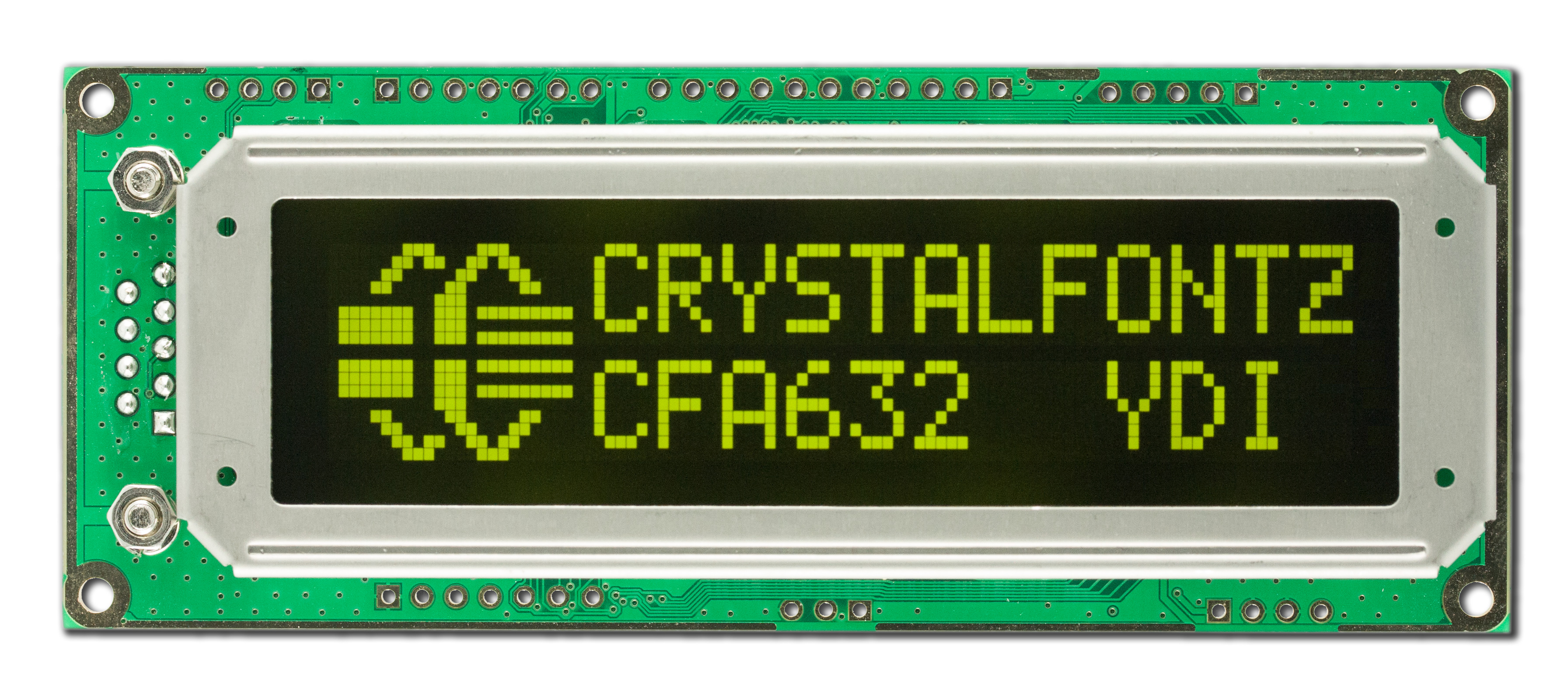 - CFA632-YDI-Kx: Yellow-green array LED backlight with negative FFSTN transmissive mode LCD. Displays yellow-green characters on a dark (near-black) background. The display can be read in normal office lighting and in dark areas. May be difficult to read in direct sunlight.