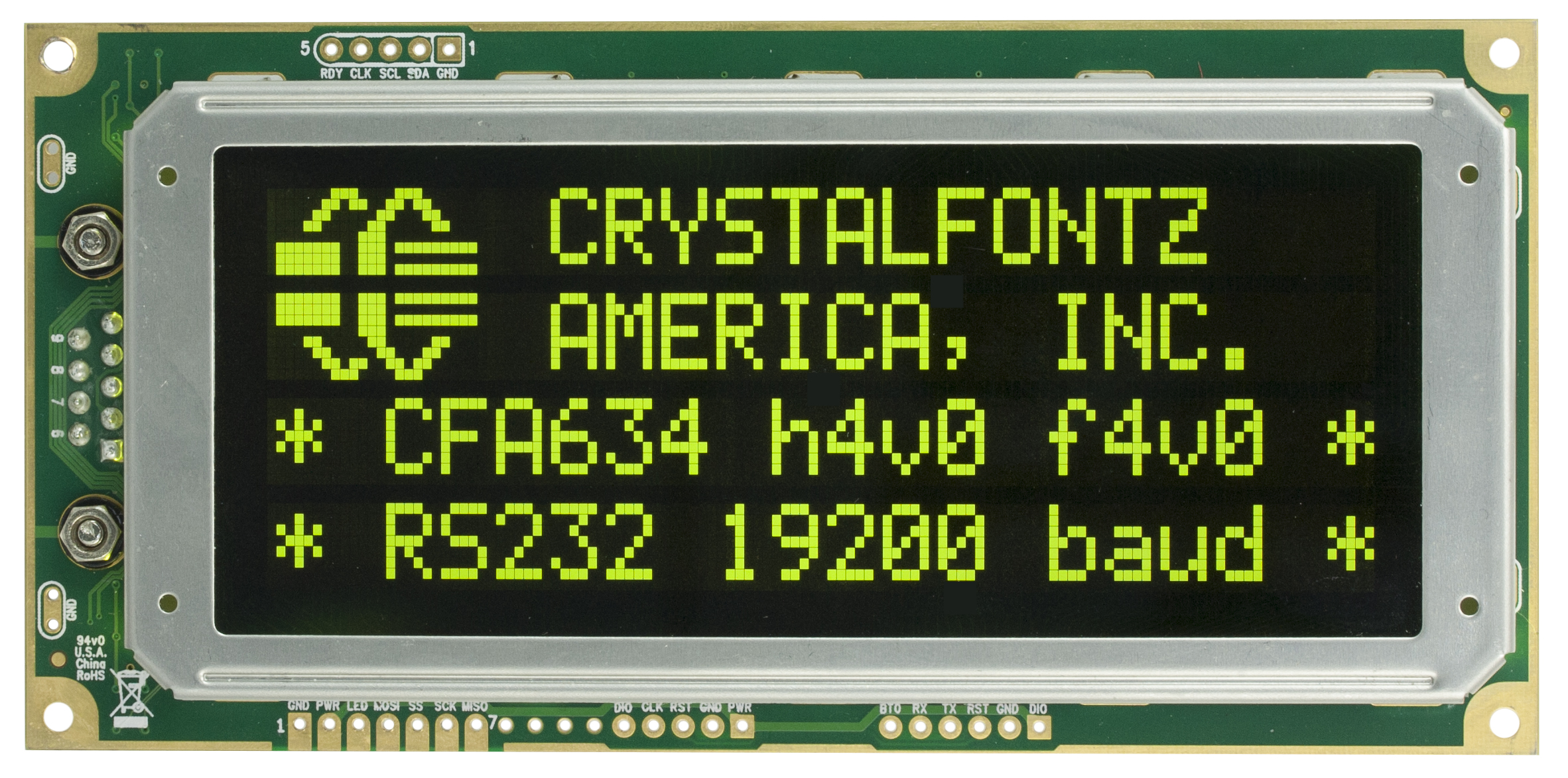 Full swing RS-232 serial 20x4 LCD, RoHS / REACH Compliant, Yellow/Green LED Backlight, FFSTN Negative (black) Transmissive, -20°C to +70°C operation, 6:00 viewing angle.