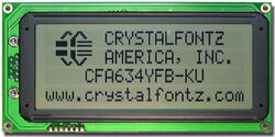 - CFA634-YDI-Kx: Yellow-green array LED backlight with negative FFSTN transmissive mode LCD. Displays yellow-green characters on a dark (near-black) background. The display can be read in normal office lighting and in dark areas. May be difficult to read in direct sunlight.