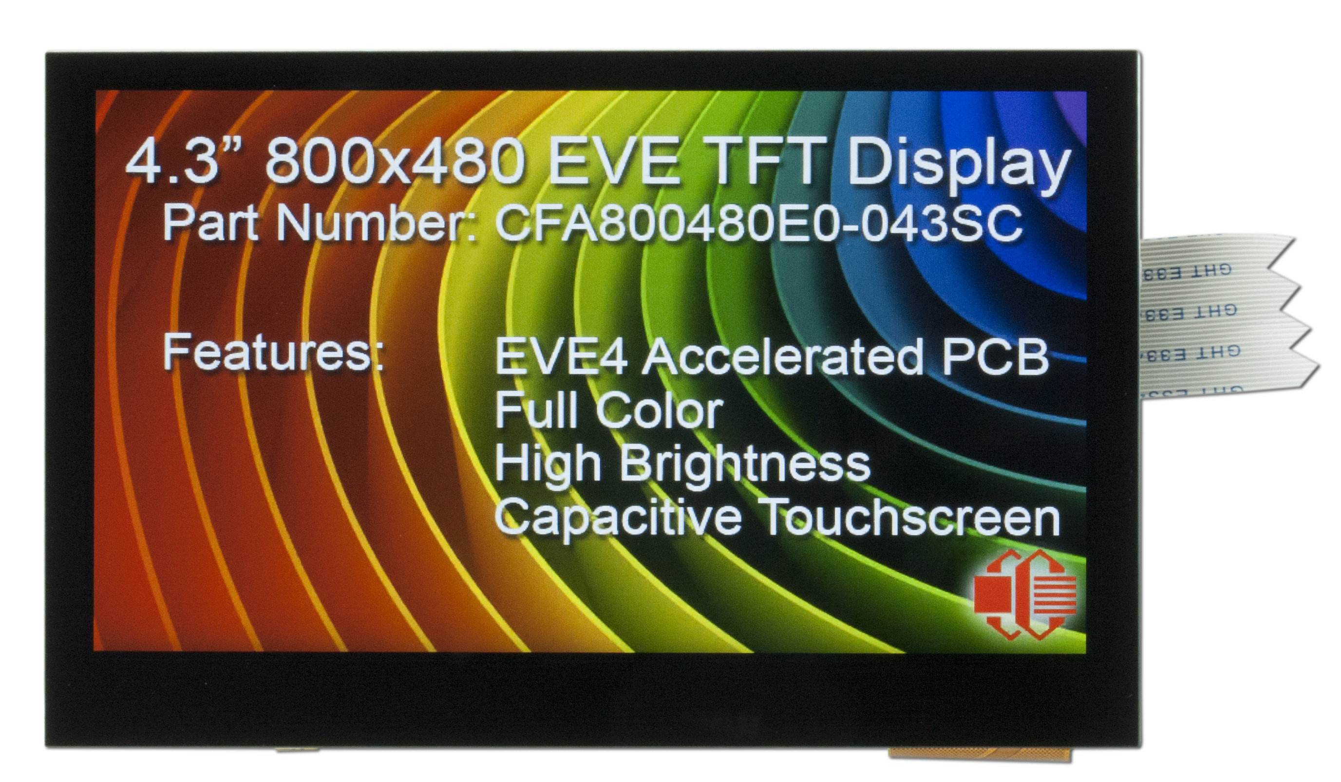 A 4.3" TFT display module with a capacitive touchscreen is a great choice for a user interface. The beautiful IPS display has a dense 800x480 pixels, and the capacitive touchscreen provides a nice finish.This module is driven by the embedded video engine (EVE) chip BT817 from Bridgetek. This simplifies the control of the display, touch reporting, backlight, and audio. The BT817 allows simple SPI commands to control this 800x480 display with full graphics and text. Plus, Bridgetek provides a suite of development tools to help make designing user interfaces easier, including on-screen buttons.