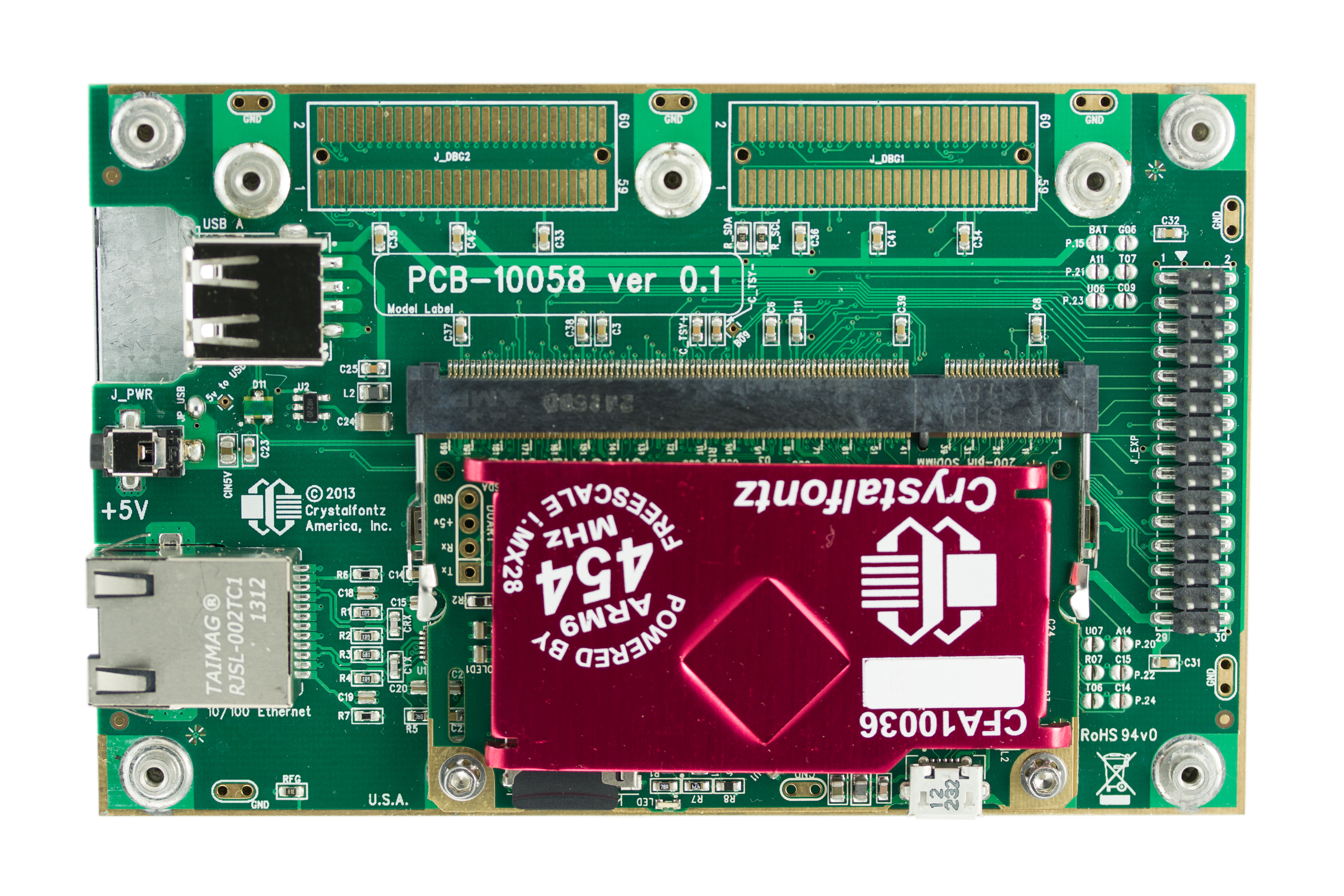 A complete package that includes our CFA10036 with a i.MX283 processor, 4.3 inch TFT touchscreen display, 10/100 Ethernet port, USB port, 128MB DDR2 RAM, μSD up to 64GB, 24 GPIO on easy-access 0.1? center header, Up to 108 GPIO on 1mm compression connector.