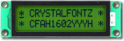 Parallel 16x2 character LCD module with a yellow-green LED backlight, STN positive display mode, and yellow-green glass with a transflective polarizer, operating at -20°C to +70°C temperature range, boasting a 6 o'clock viewing direction.