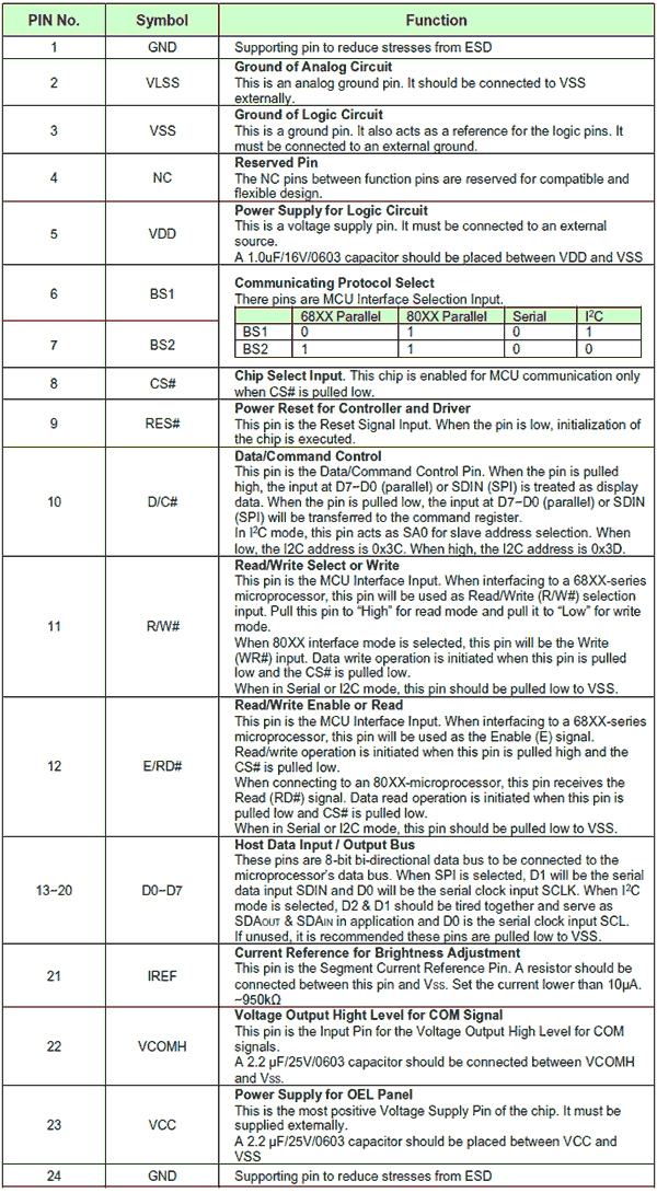 This crisp, high contrast yellow OLED has a super-wide viewing angle.This OLED can be set up to use SPI, I2C, 6800 or 8080 parallel, while still keeping a slim tail at only 24 pins.