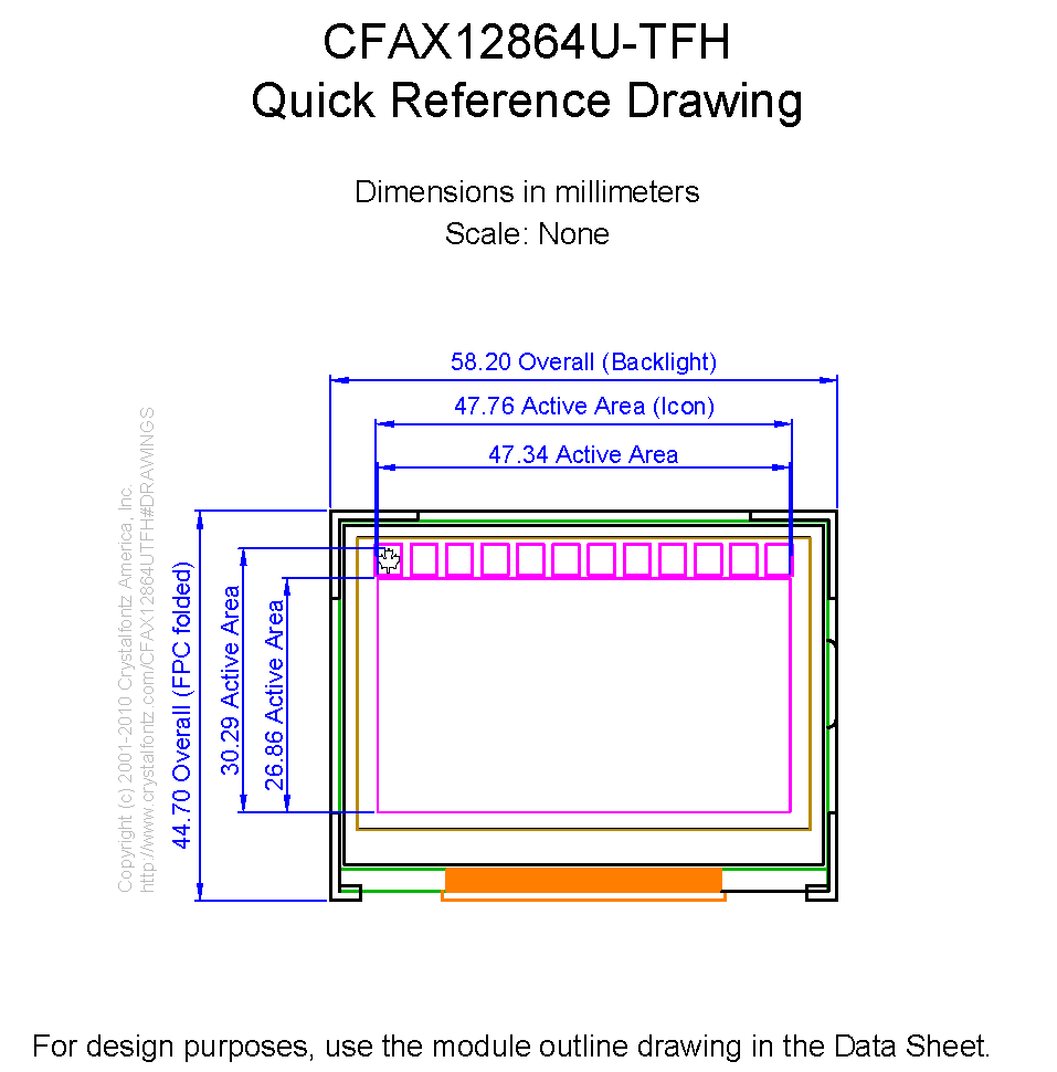 Products Affected: CFAX12864U1-TFH, CFAX12864U-TFH Date Issued: July 27, 2016 Summary: CFAX12864U and CFAX12864U1 series backlight improvements. Description: The white LED backlight of the Crystalfontz CFAX12864U and CFAX12864U1 series of compact graphic display modules is changing as a result of manufacturing improvements of white LEDs and backlight assembly. The changes are as follows: